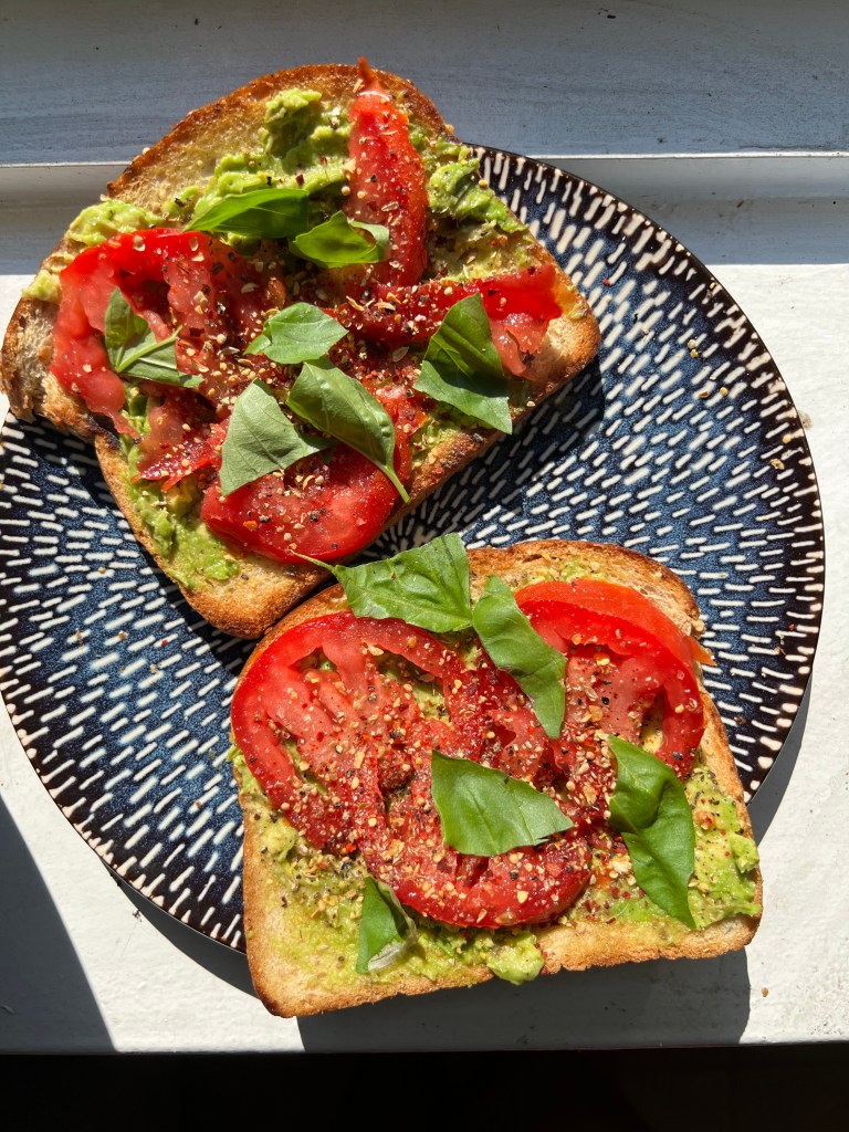 July 3 was a sneaky work day / holiday leading up to July 4th. It was busy with work but certainly not at the level of the week prior so I could certainly relax a little and also take some to cook. The most memorable things I made were less cooking and more presentation. I love bread and we’ve already established that I love tomatoes and basil so it was pretty easy to put them all together. Toasting my bread in olive oil is my new obsession so I toasted some whole wheat bread and topped it with squished avocado and sliced tomato, salt, pepper and basil. YUM (and pretty). Looking at it made me so happy and then eating it was the “cherry” on top.