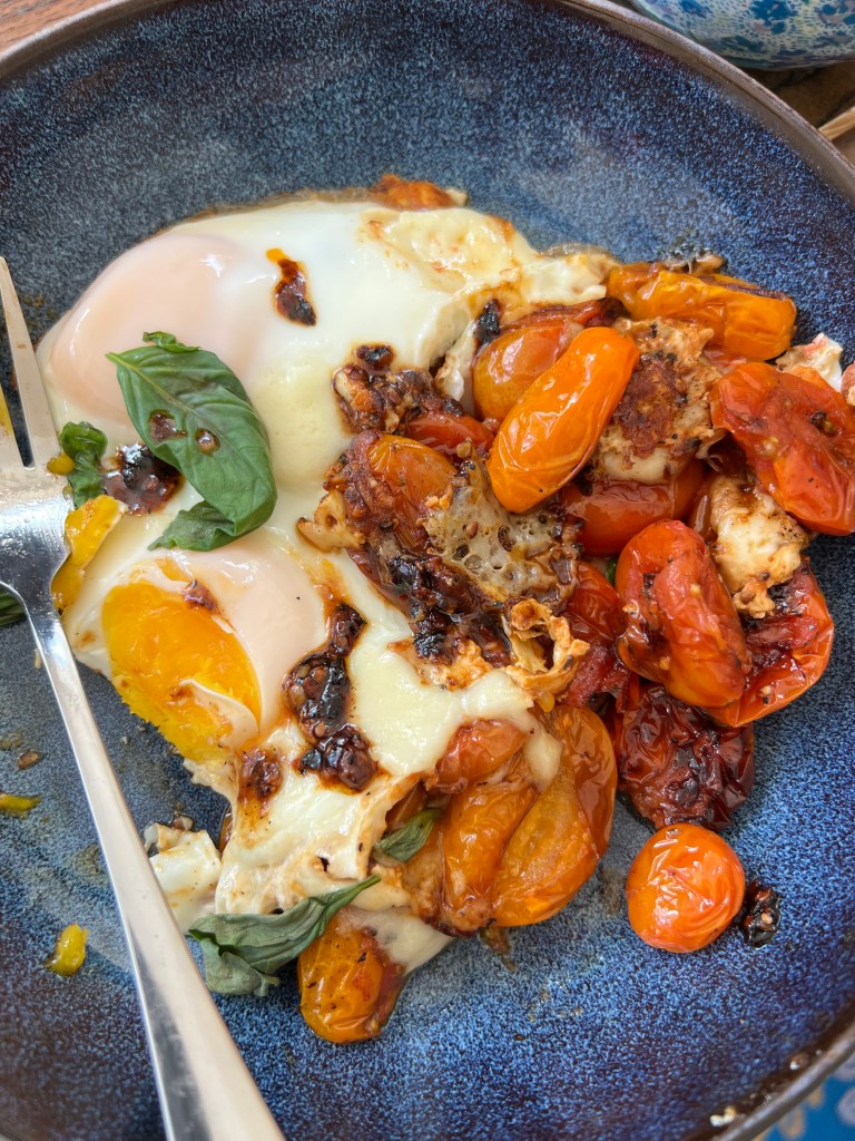 I love tomato season. Our flight from the previous day was delayed and i was struggling through a special type of jet lag that you can have when you’re in the same time zone throughout but you keep getting delayed or are subject to extremely temperamental air traffic control centers and weathers making it hard to ever know what time it is or where you are. We finally got home to New York 18 hours after we were supposed to and i was hungry for breakfast. There wasn’t a lot in my fridge but I did have grape tomatoes that looked fre$h, fresh basil from my window sill garden and eggs. Throw it all together in a pan and voila. I was a happy camper. Side note – that basil has been an addition to almost everything I’ve been cooking because it is yummy and growing in abundance.